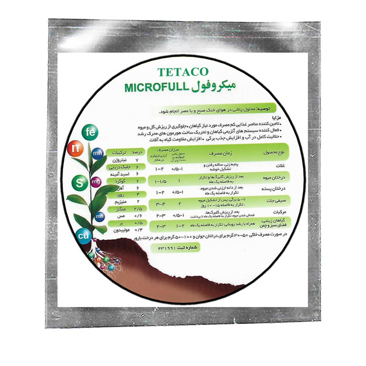 مزیت: استفاده از کلات میکروفول - تامین کننده عناصر غذایی کم مصرف مورد نیاز گیاهان - جلوگیری از ریزش گل و میوه - فعال کننده سیستم های آنزیمی گیاهان و تحریک ساخت هورمون های محرک رشد. - حلالیت کامل در آب و افزایش جذب برگی - افزایش مقاومت گیاه به آفات