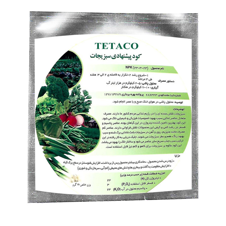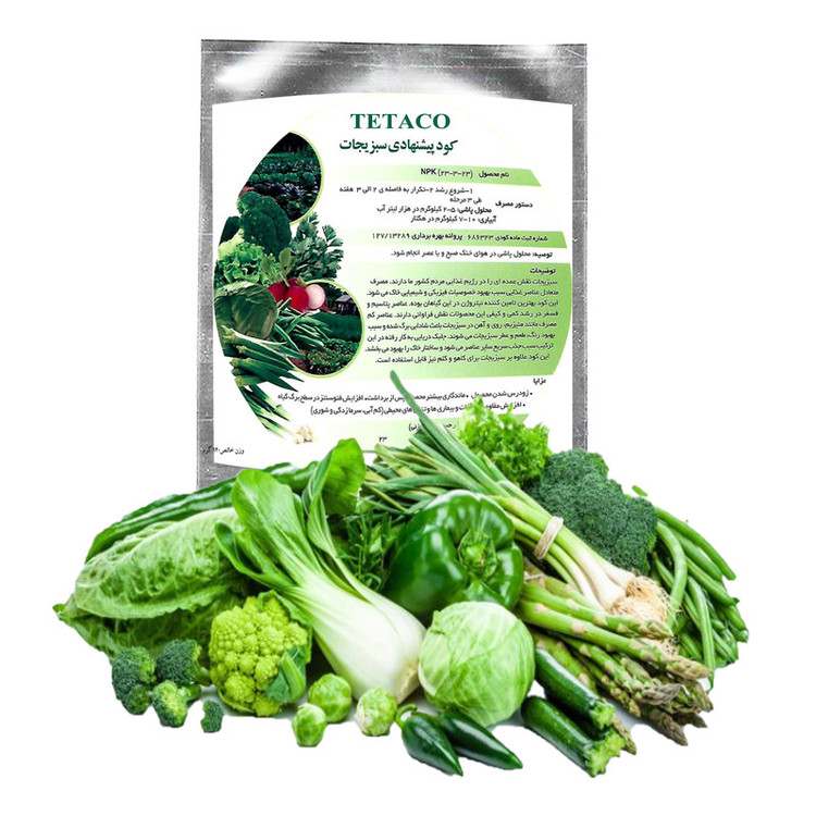 سبزیجات نقش عمده اى را در رژیم غذایى مردم کشور ما دارند. مصرف متعادل عناصر غذایى سبب بهبود خصوصیات فیزیکى و شیمیایى خاك مى شود. این کود بهترین تامین کننده نیتروژن در این گیاهان بوده. عناصر پتاسیم و فسفر در رشد کمى و کیفى این محصولات نقش فراوانى دارند. عناصر کم مصرف مانند منیزیم، روى و آهن در سبزیجات باعث شادابى برگ شده و سبب بهبود رنگ، طعم و عطر سبزیجات مى شوند. جلبک دریایى به کار رفته در این ترکیب سبب جذب سریع سایر عناصر مى شود و ساختار خاك را بهبود مى بخشد. این کود علاوه بر سبزیجات براى کاهو و کلم نیز قابل استفاده است.