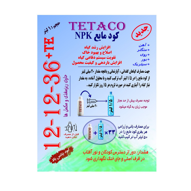 کود مایع 12-12-36+TE تتاکو شامل غلظتهای مختلفی از عناصر غذایی اصلی به همراه عناصر کمیاب یا TE (Trace Elements) میباشد. فرمول این کود شامل 12 درصد نیتروژن (N)، 12 درصد فسفر (P2O5)، 36 درصد پتاسیم (K2O) و عناصر کمیابی مانند آهن (Fe)، روی (Zn)، منگنز (Mn)، مس (Cu)، بور (B) و مولیبدن (Mo) است. این کود با ارائه عناصر غذایی اصلی و کمیاب، بهبود رشد، توسعه و عملکرد گیاهان را تضمین میکند و میتواند نقش مهمی در بهبود کیفیت و عملکرد محصولات کشاورزی ایفا کند.