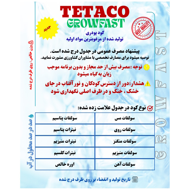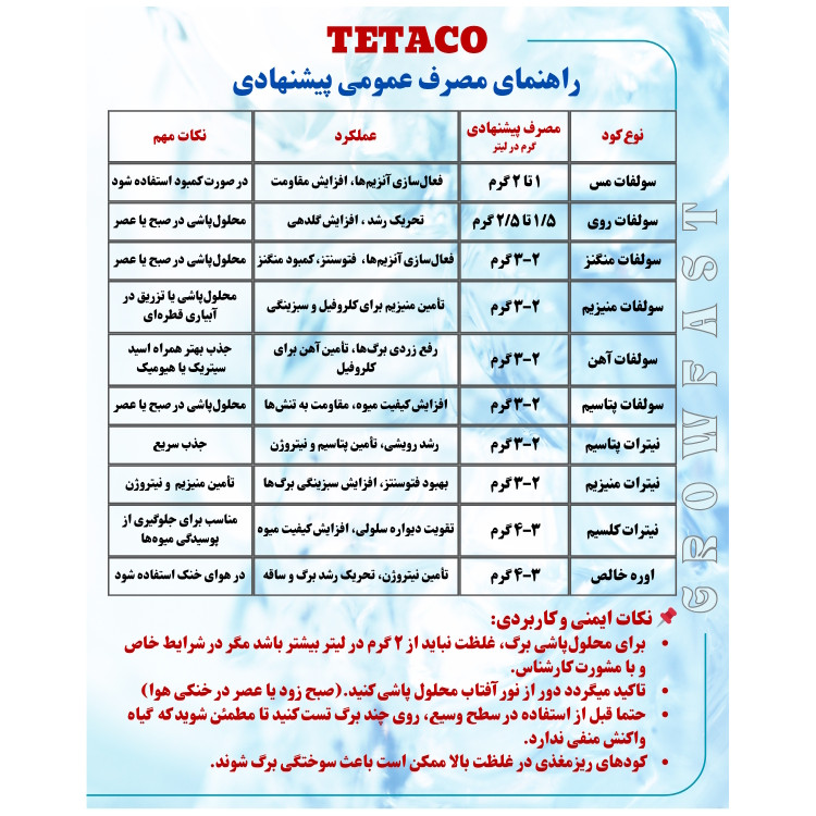 بدون بو , تهیه شده از مواد معدنی , تهیه شده از مواد ارگانیک , تهیه شده از مواد شیمیایی , عملکرد اصلی: تغذیه , عملکرد اصلی: گلدهی , لزوم استفاده بصورت محلول