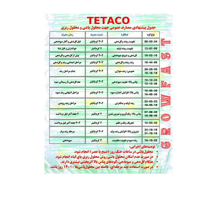 - درختان میوه: برای تقویت گلدهی و افزایش کیفیت میوهها.