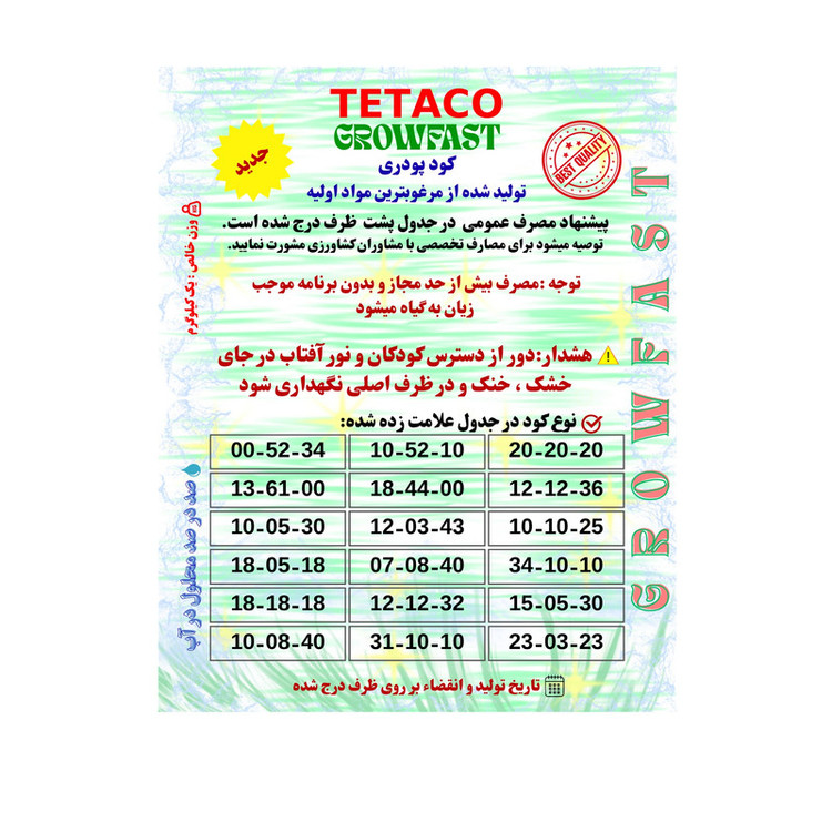 این کود یک کود کامل NPK است که شامل غلظتهای مختلفی از عناصر غذایی اصلی و ترکیبی از عناصر فرعی است. این کود NPK دارای 12% ازت (N)، 3% فسفر (P) و 43% پتاسیم (K) است. همچنین، این کود حاوی عناصر فرعی (TE) همچون آهن، روی، مس، منگنز و بور است که به گیاه کمک میکنند تا بهتر رشد کند و عملکرد بهتری داشته باشد.مقادیر عناصر فرعی در این کود معمولا به صورت ppm (قطعه در میلیون) ارائه میشوند و بسته به ترکیب و مقدار کود ممکن است مقادیر متفاوتی داشته باشند.این کود یک کود کامل NPK است که شامل غلظتهای مختلفی از عناصر غذایی اصلی و ترکیبی از عناصر فرعی است. این کود NPK دارای 12% ازت (N)، 3% فسفر (P) و 43% پتاسیم (K) است. همچنین، این کود حاوی عناصر فرعی (TE) همچون آهن، روی، مس، منگنز و بور است که به گیاه کمک میکنند تا بهتر رشد کند و عملکرد بهتری داشته باشد.مقادیر عناصر فرعی در این کود معمولا به صورت ppm (قطعه در میلیون) ارائه میشوند و بسته به ترکیب و مقدار کود ممکن است مقادیر متفاوتی داشته باشند.