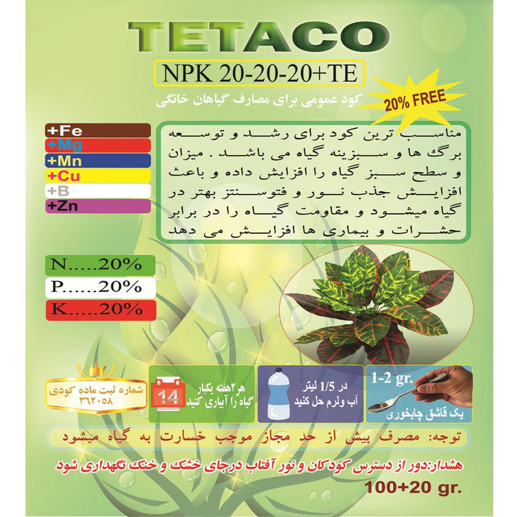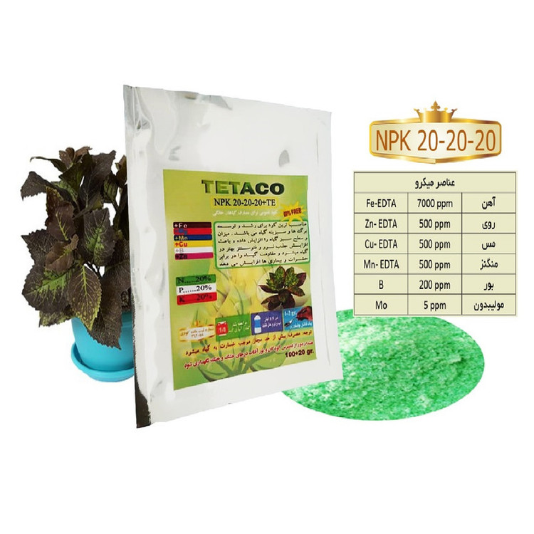 اگر به گل و گیاهان علاقه دارید و به سلامت و شادابی آنها اهمیت می دهید و بدنبال راهی برای رفع کمبودهای گیاهان هستید کود پودری 20-20-20 تتاکو بهترین انتخاب برای شما می باشد. این کود پودری از سه عنصر اصلی نیتروژن، فسفر و پتاس تشکیل شده و مقدار هر یک از این عناصر در این کود 20 درصد می باشد به همین دلیل به آن سه بیست گفته می شود و در واقع این سه عنصر نیازهای اصلی گیاه از جمله رشد سریعتر، سرسبزی و فتوسنتز بیشتر و گل دهی آسانتر را برطرف می نمایند. توازن پایدار فرایند های فیزیکی و شیمیایی و بیولوژیکی خاک و مدیریت مناسب عناصر تغذیه ای آن موجب افزایش توان باروری و تولیدی خاک می گردد. استفاده از کود کامل حاوی عناصر نیتروژن، پتاسیم و فسفر فقر عناصر مغذی خاک را برای گیاهان جبران می نماید. نیتروژن:کمک به فتوسنتز و بهبود کیفیت محصول، افزایش بذر و میوه، رشد سریعتر شاخ و برگ گیاه از مزایای استفاده از نیتروژن است. فسفر:مهمترین عامل در روند صحیح فتوسنتز برای گیاه است همچنین فسفر به ریشه زایی بهتر و ازدیاد شکوفه کمک می کند. پتاس:در گیاهان زینتی به گلدهی و در درختان به درشت شدن میوه کمک مؤثری می کند. جمع این عناصر و دیگر ریز مغذی ها نظیر مس، آهن، منگنز، مولیبدن، زینک و کلات آهن در کود کامل، شما را از مصرف دیگر کودها بی نیاز می سازد. روش مصرف: روی بسته بندی درج گردید.