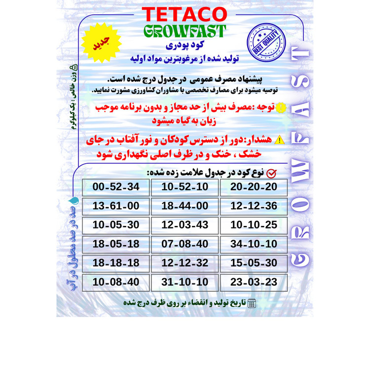 بدون بو , تهیه شده از مواد معدنی , تهیه شده از مواد شیمیایی , عملکرد اصلی: تغذیه , عملکرد اصلی: گلدهی , لزوم استفاده بصورت محلول