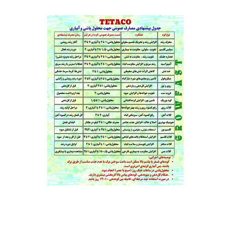- در صورت ترکیب این کود با سایر مواد مغذی یا سموم کشاورزی، ابتدا یک آزمایش کوچک انجام دهید تا از سازگاری آنها اطمینان حاصل کنید.