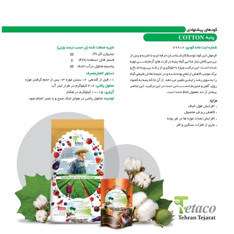 کود کشت پنبه تتاکو، کود پنبه، افزایش عملکرد محصول پنبه، کیفیت الیاف پنبه، مقاومت گیاه پنبه، حاصلخیزی خاک، صرفهجویی در مصرف آب، تغذیه گیاه پنبه، کود ارگانیک
