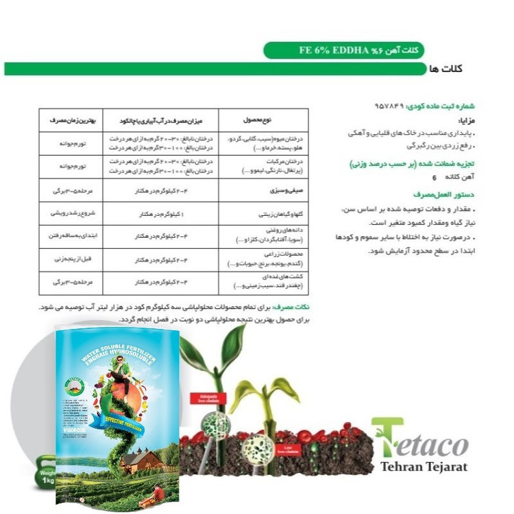 کود کلات آهن 6%، یک نوع کود شیمیایی است که حاوی آهن (Fe) و کلات (K) می باشد. این کود معمولاً به صورت پودری یا کریستالی در دسترس است و برای استفاده در باغبانی و کشاورزی مناسب است. آهن یکی از عناصر ریزمغذی مهم برای گیاهان است که در فرآیند ساخت کلروفیل و تنظیم فعالیت آنزیمهای گیاهی نقش دارد. با افزایش مقدار آهن در خاک و تامین نیاز گیاهان به این عنصر، می توان رشد و توسعه بهتری برای آنها فراهم کرد. کلات نیز به عنوان یک نوع نیتروژن و پتاسیم اصلی در کودهای شیمیایی شناخته شده است. این عنصر برای تحریک رشد و توسعه گیاهان، افزایش مقاومت آنها به شرایط نامساعد محیطی و تنظیم فعالیت آنزیمهای گیاهی مفید است. با استفاده از کود کلات آهن 6% می توان مقدار آهن و کلات مورد نیاز گیاهان را تأمین کرد و رشد و توسعه آنها را بهبود بخشید. با این حال، باید به میزان استفاده، روشهای استفاده و نحوه اعمال کود توسط تولیدکننده کود یا کارشناسان کشاورزی مشورت کنید.