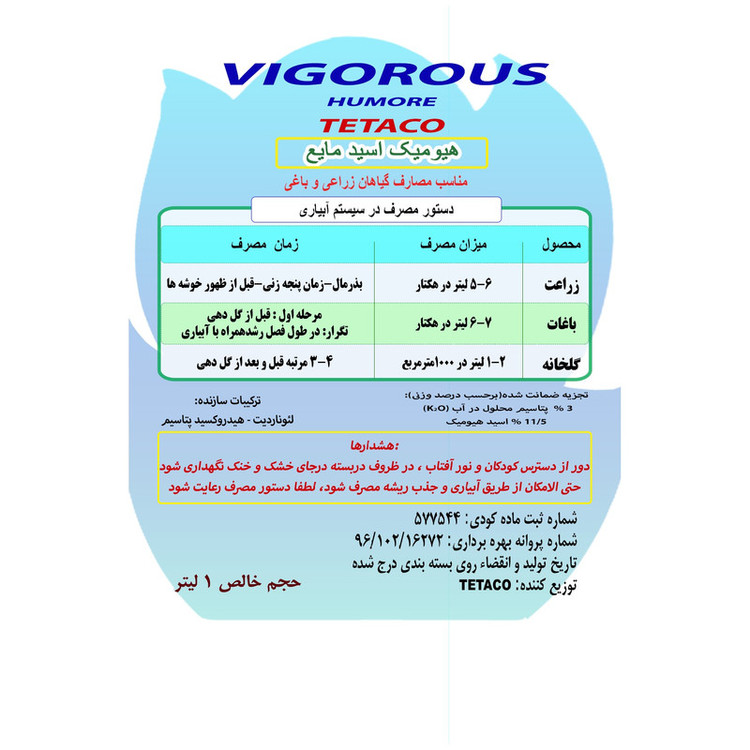 کود هیومیک اسید مایع تتاکو مدل VIGOROUS حجم 1 لیتر