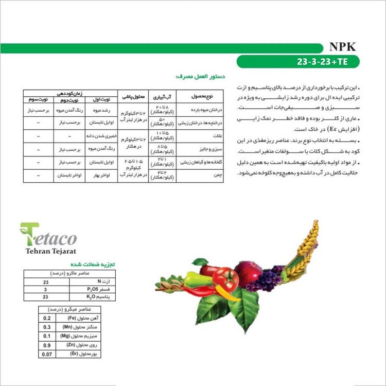 کود NPK 23-3-23+TE یکی از بهترین کودهای موجود برای بهبود رشد و عملکرد گیاهان است. این کود شامل ترکیباتی از عناصر غذایی کلیدی است که به گیاهان کمک میکند تا بهترین شرایط رشد را داشته باشند. ترکیب 23-3-23 در این کود به این معنی است که حاوی 23 درصد نیتروژن (N)، 3 درصد فسفر (P) و 23 درصد پتاسیم (K) است. این ترکیب به گیاهان کمک میکند تا رشد سریعتری داشته باشند و در عین حال سازگاری بیشتری با شرایط مختلف محیطی را داشته باشند. علاوه بر این، کود NPK 23-3-23+TE حاوی عناصر کمیابی همچون روی، منگنز، مس و بور است. این عناصر کمیاب به گیاهان کمک میکنند تا برای مقابله با تنشهای مختلف محیطی و بیماریها، قویتر شوند و عملکرد بهتری داشته باشند. همچنین، این کود شامل عناصر کمیابی TE یا Micro Nutrients نیز میشود. این مواد شیمیایی شامل آهن، منگنز، مس، روی، بور و مولیبدن است. این عناصر کمیاب به گیاهان کمک میکنند تا به درستی عملکرد کرده و رشد کنند. آهن برای تولید کلروفیل بسیار حائزمی است و منگنز و مس برای فعالیت آنزیمهای مختلفی در گیاهان ضروری هستند. روی و بور نیز برای رشد و توسعه سلولهای گیاهی ضروری هستند و مولیبدن برای تولید آنزیمهایی که موجب تبدیل نیتروژن به فرم قابل جذب برای گیاه میشوند، لازم است. با استفاده از کود NPK 23-3-23+TE، شما میتوانید رشد و عملکرد گیاهان خود را بهبود بخشید و محصولات با کیفیت بالا و بهتری را به دست آورید. همچنین، این کود به دلیل داشتن غلظت عالی عناصر، نیاز به مصرف مکرر کمتری دارد و میتواند هزینههای کشت را کاهش دهد. با استفاده از کود NPK 23-3-23+TE، میتوانید از پتانسیل کامل گیاهان خود استفاده کنید و در عین حال محیط زیست را نیز حفظ کنید.