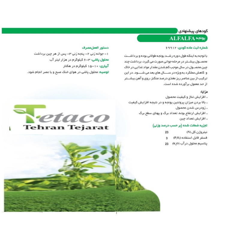 یونجه یکی از محصولات عمده دامداری است و استفاده از کود مخصوص آن میتواند به بهبود عملکرد و کیفیت محصول کمک کند. کود مخصوص کشت یونجه باید شامل عناصر غذایی اصلی نیتروژن، فسفر و پتاسیم باشد، همچنین میتواند شامل عناصری مانند کلسیم، منیزیم و سایر عناصر مورد نیاز گیاهان باشد. در ادامه، چند نکته در خصوص کود مخصوص کشت یونجه آورده شده است: 1. نیاز به نیتروژن: یونجه نیاز زیادی به نیتروژن دارد، بنابراین کود مخصوص یونجه باید حاوی مقدار قابل توجهی از این عنصر باشد. 2. فسفر: فسفر نیز یکی از عناصر مهم برای کشت یونجه است، به خصوص در فصل رشد اولیه. بنابراین، کود یونجه باید شامل مقدار مناسبی فسفر باشد. 3. پتاسیم: پتاسیم نیز یکی از عناصر مهم برای رشد و توسعه یونجه است. کود مخصوص یونجه باید حاوی مقدار کافی پتاسیم باشد. 4. مقدار استفاده: مقدار استفاده از کود مخصوص کشت یونجه باید بر اساس نیاز گیاهان و شرایط خاک و هوایی منطقه تعیین شود. 5. پوشش خاک: کشت یونجه باید با رعایت پوشش خاک مناسب صورت بگیرد تا عملکرد و کیفیت محصول بهبود یابد. 6. رعایت اصول ایمنی: در هنگام استفاده از کود مخصوص یونجه، باید از رعایت اصول ایمنی مانند استفاده از پوششهای محافظ و عدم استفاده در زمان باد شدید، اطمینان حاصل کنید. در کل، برای استفاده بهینه از کود مخصوص کشت یونجه، باید نیازهای گیاهان را بشناسیم و مقادیر مناسب از کود را در زمان مناسب و با رعایت اصول ایمنی استفاده کنیم.