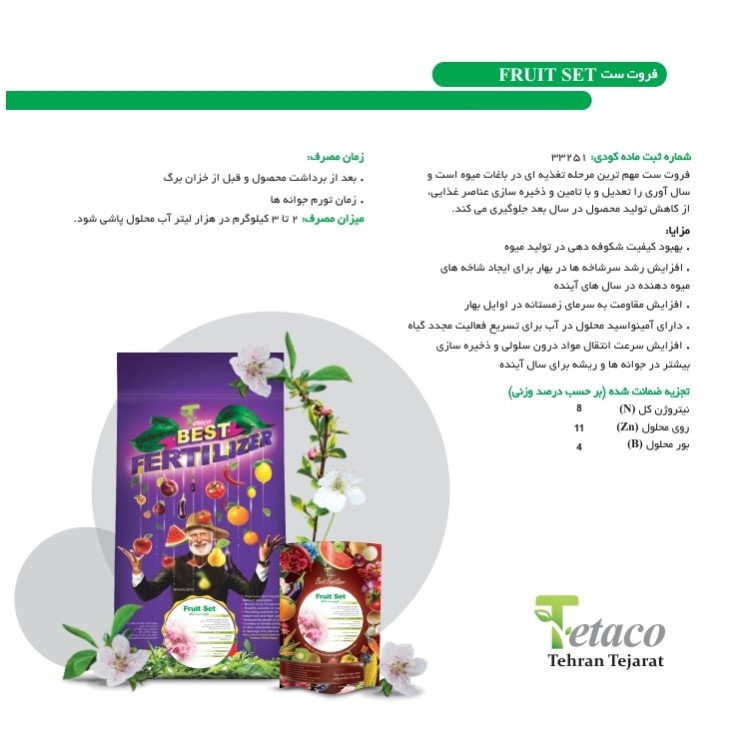کود فروت ست تتاکو، افزایش باردهی، تقویت درختان میوه، محلولپاشی، آبیاری قطرهای، عناصر ریزمغذی، نیتروژن، پتاسیم، فسفر، کلسیم، رفع کمبود تغذیهای گیاهان، کیفیت میوهها، کشاورزی حرفهای، باغداری مدرن