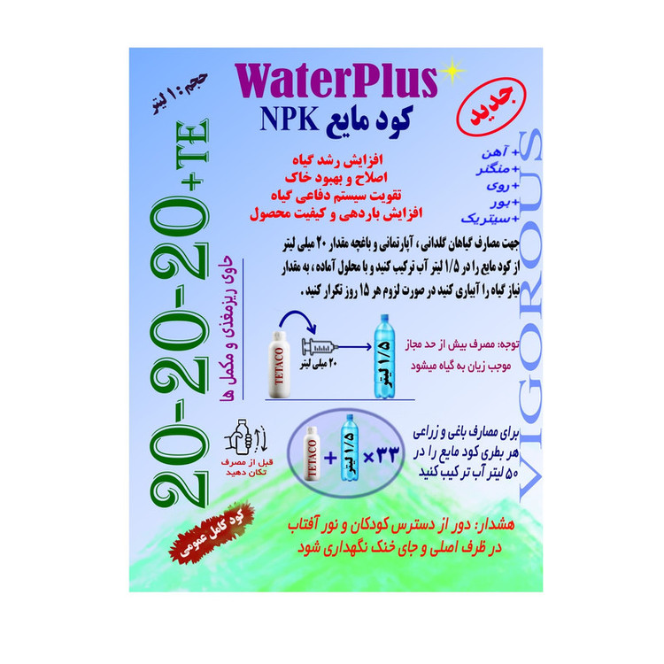 کود مایع NPK، کود 20-20-20 واترپلاس، عناصر ریزمغذی TE، تقویت گیاهان، افزایش بازدهی محصولات کشاورزی، محلولپاشی کشاورزی، سیستم آبیاری قطرهای، کود کامل کشاورزی، تقویت ریشه گیاهان، افزایش مقاومت گیاهان.