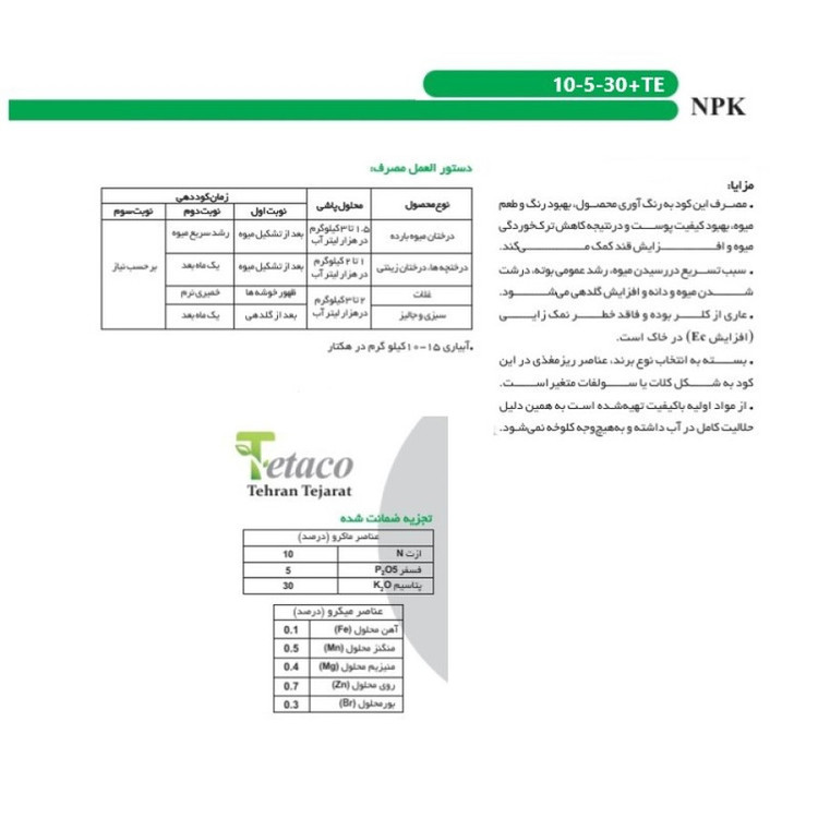 کود NPK 10-5-30+TE نوعی کود شیمیایی است که شامل سه عنصر اصلی نیتروژن (N)، فسفر (P) و پتاسیم (K) است که به ترتیب درصدهای 10، 5 و 30 درصدی دارند. همانطور که می دانیم، این سه عنصر اصلی برای رشد و توسعه گیاهان ضروری هستند. علاوه بر این سه عنصر اصلی، کود NPK 10-5-30+TE شامل عناصر کمیابی مانند روی، منیزیم و آهن نیز می باشد که به عنوان عناصر تکمیلی (TE) شناخته می شوند. استفاده از کود NPK 10-5-30+TE به دلیل حاوی نسبت متعادلی از عناصر اصلی نیتروژن، فسفر و پتاسیم که به ترتیب برای رشد سریع و سالم گیاه، تقویت ساختار گیاه و افزایش مقاومت در برابر شرایط نامساعد محیطی و همچنین جلوگیری از بیماری ها و آفات، مفید می باشد. همچنین عناصر کمیابی موجود در این کود، به گیاه کمک می کنند تا بهترین عملکرد را داشته باشد. نسبت عناصر در کود NPK 10-5-30+TE برای تعدادی از گیاهان بهینه است. برای مثال، این کود برای گیاهانی مانند گوجه فرنگی، سیب زمینی، خیار، بادمجان، هویج، کدو، آفتابگردان، سویا، کنجد، گل های زینتی، درختان میوه و گیاهان دارویی بهینه استفاده می شود. استفاده از کود NPK 10-5-30+TE می تواند به گیاهان در رشد و توسعه کمک کند، عملکرد آنها را افزایش دهد و به دستیابی به محصولات با کیفیت بیشتر کمک کند. همچنین، استفاده از این کود می تواند به کشاورزان کمک کند تا در مصرف آب صرفه جویی کنند و در عین حال بهبود عملکرد گیاهان را ایجاد کنند. بسته به نوع کشت و نیاز گیاه، می توان از کود NPK 10-5-30+TE در شکل های مختلفی مانند پودر، کود رقیق شده، کود مایع و غیره استفاده کرد. همچنین باید توجه داشت که مصرف این کود باید بر اساس نیاز گیاهان و شرایط محیطی مورد استفاده تعیین شود و در صورت استفاده نادرست ممکن است به گیاهان صدمه بزند. در کل، کود NPK 10-5-30+TE یک کود شیمیایی است که در محیط کشاورزی برای بهبود رشد و توسعه گیاهان، افزایش عملکرد و بهبود کیفیت محصولات استفاده می شود. با این حال، برای استفاده از آن، باید نیازهای گیاهان و شرایط محیطی را به دقت بررسی کرد و بهترین روش مصرف را تعیین کرد.
