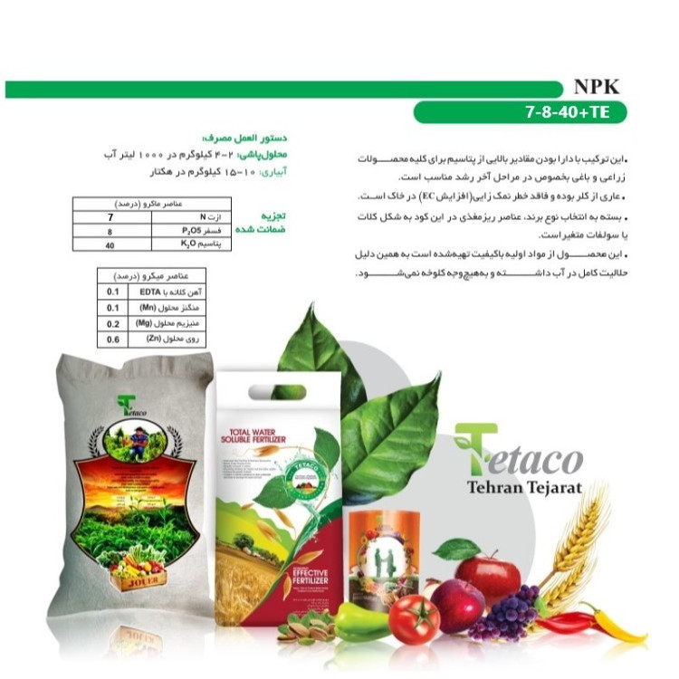 کود NPK 7-8-40+TE نیز همانند کود NPK 10-8-40+TE، یک کود مخلوط است که شامل سه عنصر اصلی نیتروژن (N)، فسفر (P) و پتاسیم (K) با نسبت 7-8-40 به ترتیب است. همچنین، این کود شامل عناصر کممقداری (TE) نیز میباشد که برای رشد و توسعه گیاهان ضروری هستند. نسبت 7-8-40 به این معناست که در هر 100 واحد از این کود، 7 واحد از نیتروژن، 8 واحد از فسفر و 40 واحد از پتاسیم وجود دارد. این نسبتها برای کشت و پرورش بسیاری از گیاهان بسیار مفید هستند، به ویژه برای گیاهانی که برای رشد و توسعه آنها نیاز به پتاسیم زیادی دارند مانند سیب زمینی، خیار، گوجه فرنگی و بادمجان. استفاده از کود NPK 7-8-40+TE به گیاهان میتواند کمک کند تا رشد و توسعه بهتری داشته باشند و میوههایی با کیفیت به دست آورند. با این حال، برای استفاده از این کود باید دقت کنید که به میزان مناسبی استفاده شود تا به گیاهان صدمه نرساند. همچنین، باید دستورالعملهای تولید کننده کود را با دقت مطالعه کرده و به مقدار و زمان بندی صحیح توجه کنید.
