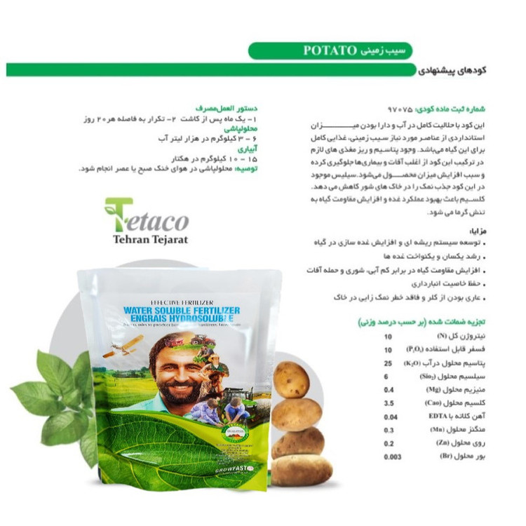 کود سیب زمینی یکی از کودهای مورد استفاده در کشاورزی است که به منظور افزایش عملکرد و بهبود کیفیت محصولات استفاده میشود. این کود شامل موادی است که حاوی عناصر غذایی مورد نیاز گیاه سیب زمینی میباشد. اصولا کود سیب زمینی شامل نیتروژن، فسفر، پتاسیم و عناصر کم مقداری مانند روی، منگنز، آهن و مس است. نیتروژن از اجزای اصلی کود سیب زمینی است که برای رشد سریع و بهتر گیاه سیب زمینی به کار میرود. فسفر از جمله عناصری است که برای تقویت ریشه وساختار گیاه سیب زمینی مورد نیاز است. پتاسیم نیز به منظور افزایش تعداد و اندازه سیب زمینی و همچنین بهبود خواص ذائقی و نگهداری محصول مورد استفاده قرار میگیرد. استفاده از کود سیب زمینی به عنوان یک منبع غذایی برای گیاه، باعث افزایش عملکرد و بهبود کیفیت محصول میشود. همچنین، این کود میتواند بهبود ساختار خاک و افزایش حاصلخیزی آن را نیز به همراه داشته باشد.