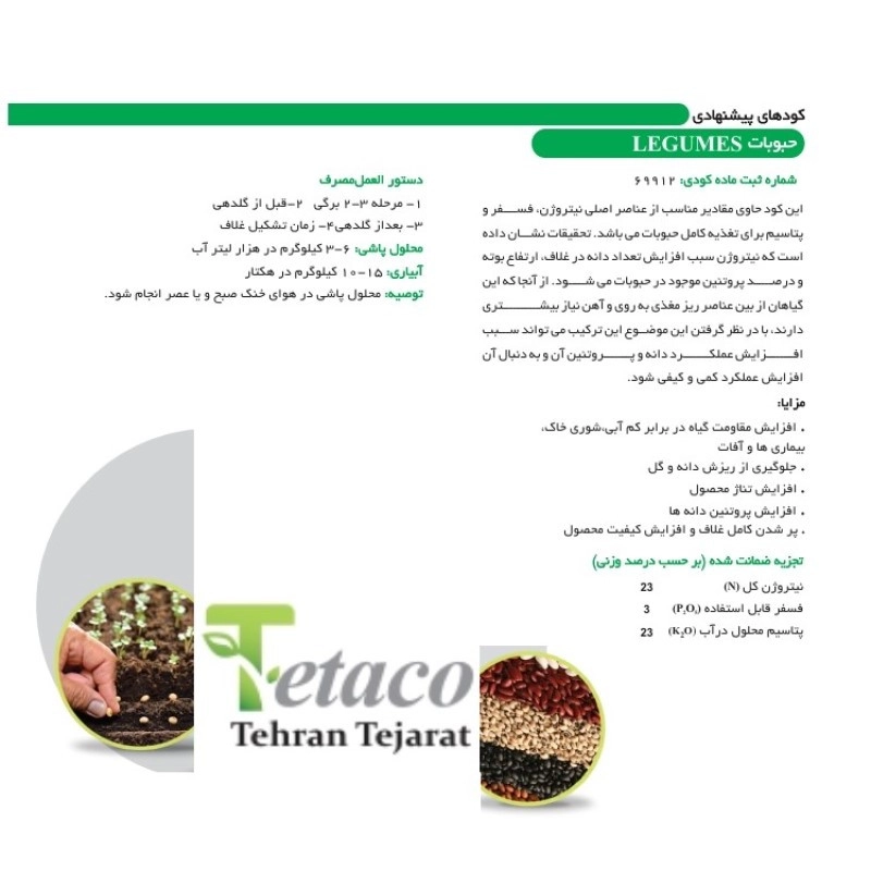 حبوبات به عنوان یکی از مهمترین محصولات کشاورزی در دنیا، از نظر تغذیهای و اقتصادی بسیار ارزشمند هستند. برای داشتن عملکرد بهتر و به حداکثر رسیدن به محصول با کیفیت، استفاده از کود مخصوص حبوبات بسیار مفید است. کود مخصوص حبوبات حاوی عناصر غذایی مختلفی است که به گیاهان حبوبات ارائه میدهد و باعث افزایش رشد و توسعه بیشتر، بهبود عملکرد برداشت و افزایش محصولات با کیفیت میشود. این کود شامل عناصر غذایی نیتروژن، فسفر، پتاسیم، کلسیم و منیزیم است که به دلیل ترکیب مناسب و نسبت دقیق آنها، به گیاهان حبوبات کمک میکند تا به بهترین شکل ممکن رشد کنند و بیشترین عملکرد را در هنگام برداشت داشته باشند. استفاده از کود مخصوص حبوبات، به دلیل داشتن عناصر غذایی مورد نیاز و نسبت مناسب آنها میتواند به کاهش هزینههای تولید و افزایش بهرهوری در کشاورزی کمک کند. این کود میتواند به صورت آلی و شیمیایی به دست آید که هر دو انواع آن میتوانند به بهبود رشد و عملکرد گیاهان حبوبات کمک کنند. با استفاده از کود مخصوص حبوبات، میتوانید به بهبود عملکرد و کیفیت محصولات خود برای تامین نیازهای بازار داخلی و خارجی کمک کنید. پس از استفاده از این کود میتوانید با گل های بیشتر، رشد بهتر و محصولات با کیفیت بیشتری مواجه شوید.